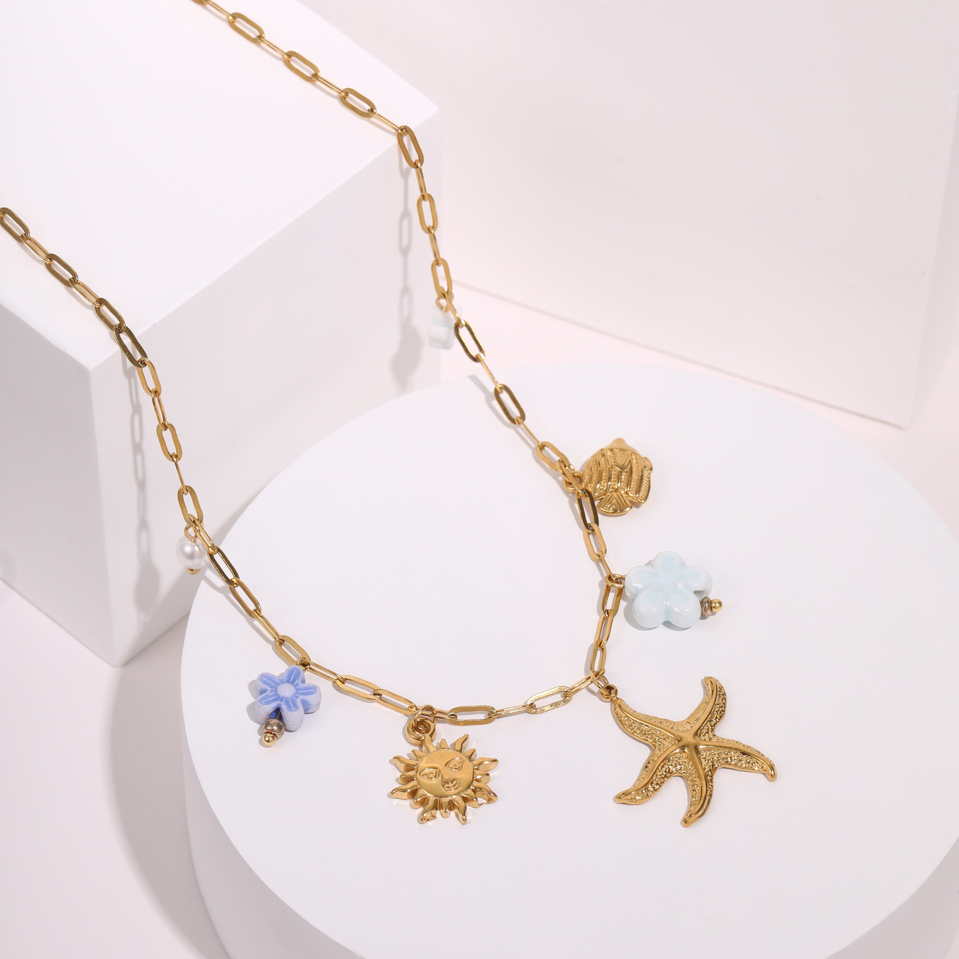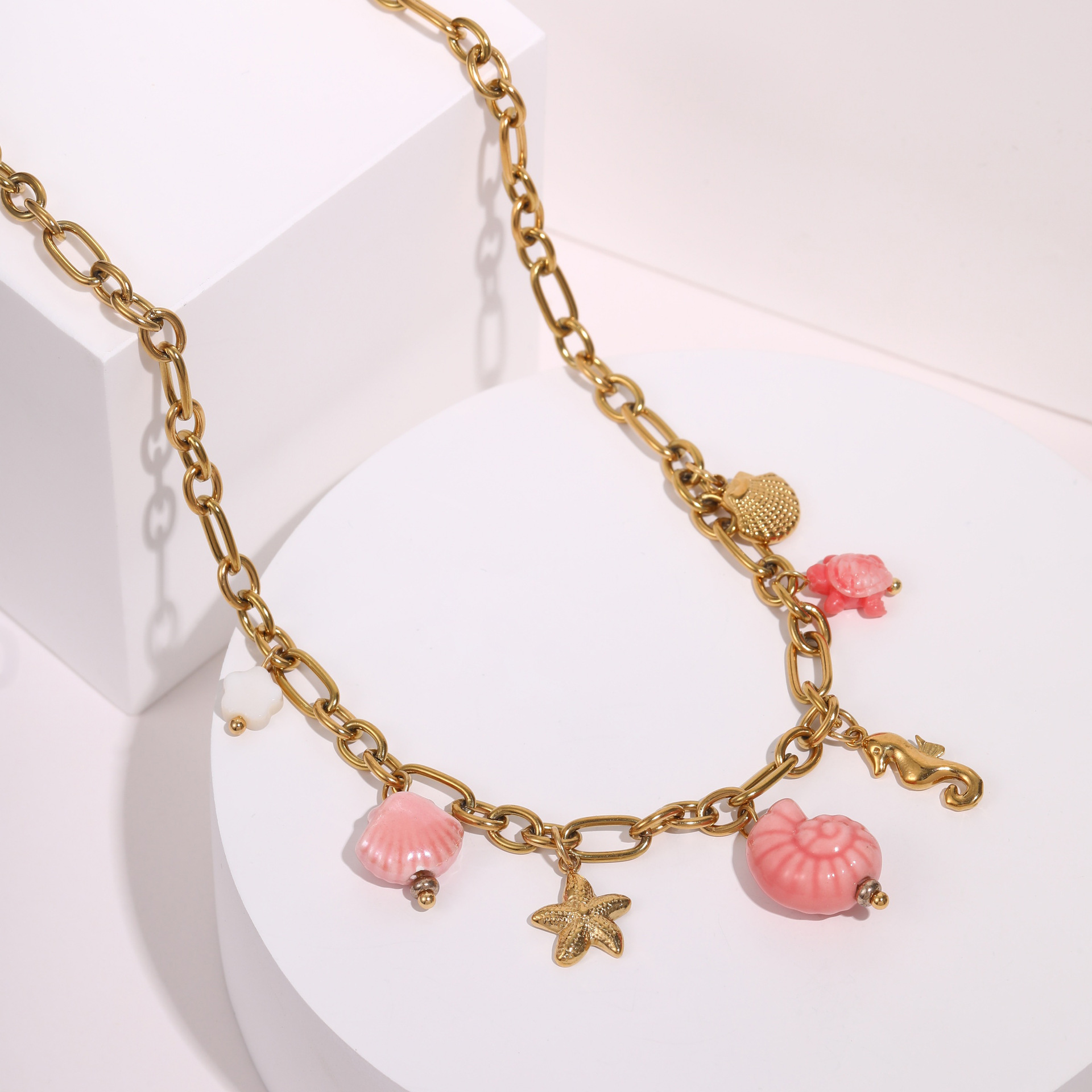 批发不锈钢18k镀金夏季沙滩贝壳珍珠防水首饰项链