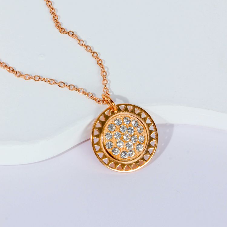 "三色圆形镂空镶钻玫瑰金不锈钢项链"