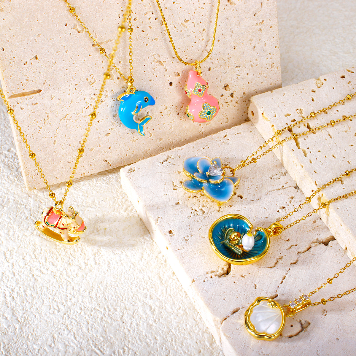 "18K镀金不锈钢彩色方形心形锆石圆形球形吊坠项"