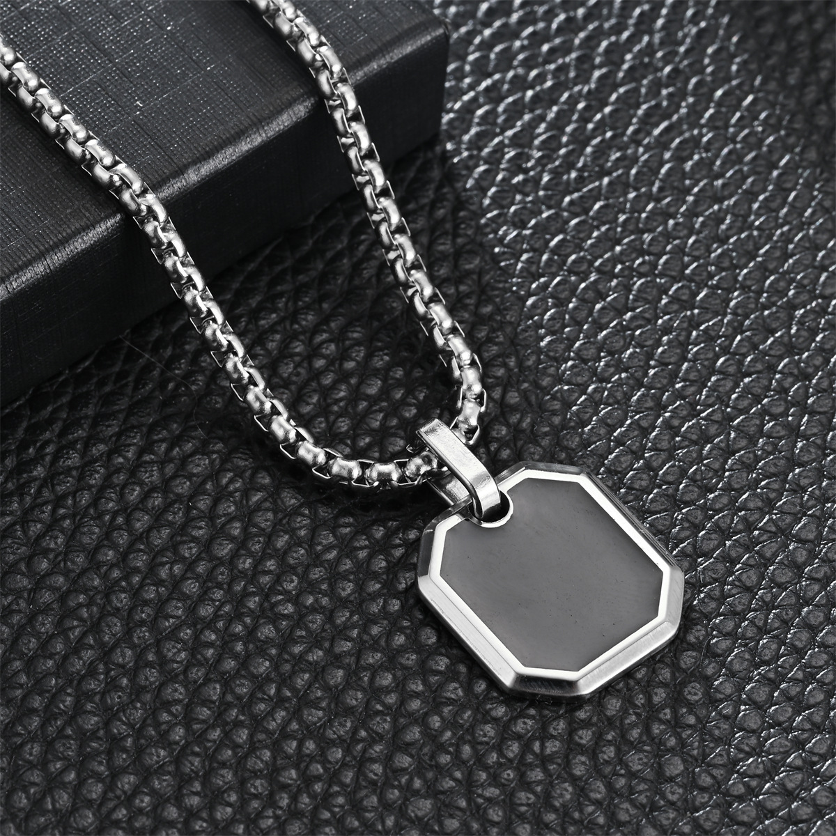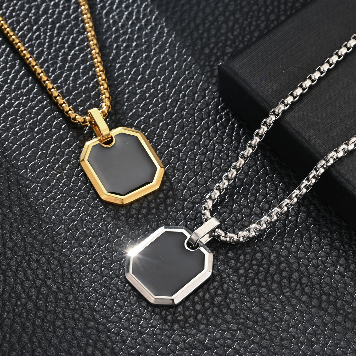 18K镀金不锈钢男士项链方形珍珠链油滴方形吊坠时